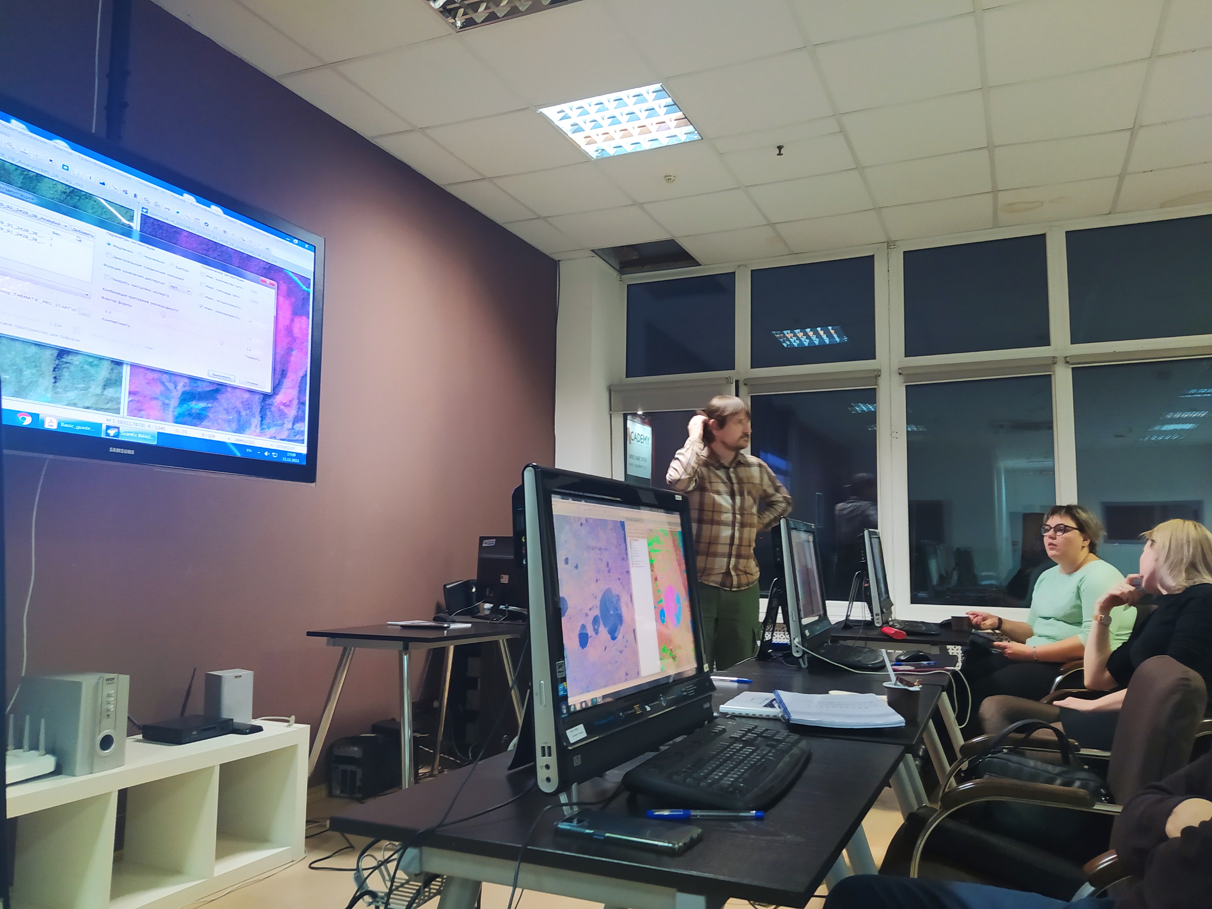 Обучающий курс был разделен на теоретическую и практическую части. Теоретическая часть включала в себя основные сведения о космических снимках, различных видах съемочных систем, основные подходы по коррекции геометрических и иных искажений космических снимков, методы построения цифровых моделей рельефа и другие темы. В ходе выполнения практической части курса инженеры отдела ДН и ГИС освоили приемы работы в отечественном программном обеспечении ScanEx Image Processor - методы анализа, обработки и классификации изображений, в том числе способы классификации и тематической обработки данных ДЗЗ с применением модуля Thematic Pro v5.
